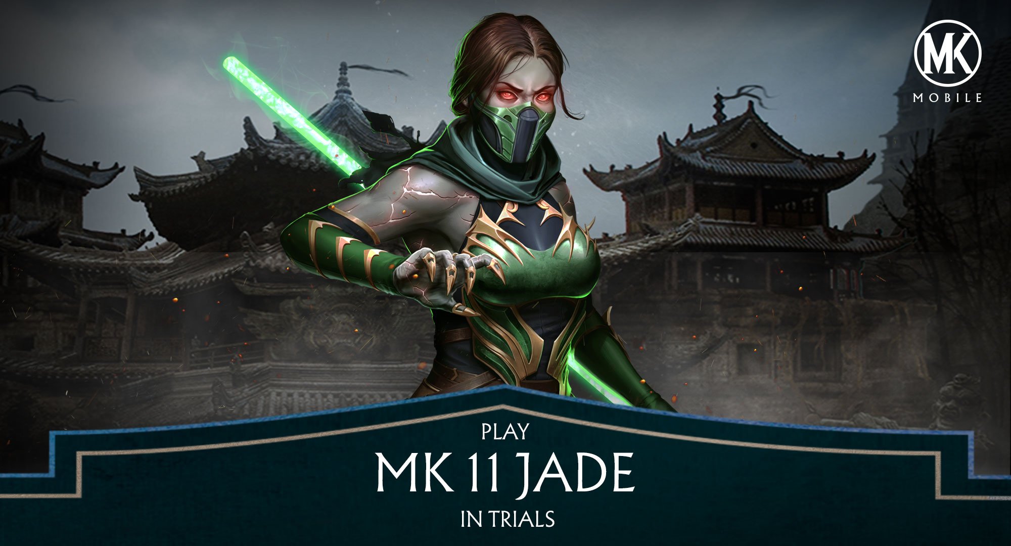 Um novo modo chegou ao MK Mobile para animar os jogadores, ele se chama "Modo de Teste". Ele se assemelha bastante com o Modo Desafio com uma pitadinha do Modo de Batalha, com cinco torres ao todo e em cada luta você pode é obrigado a jogar com um personagem específico, no caso a Jade (MK11), sem deixar ele ser derrotado. Essa carta da Jade traz a edeniana com o seu traje padrão do Mortal Kombat 11, que será lançado no dia 23/04 para consoles/PC, na versão espectro. Ainda há muita especulação sobre isso já que mesmo sendo espectro desde o fim do MK9, não fez aparição nem sequer como NPC no Modo História. A suspeita é que ela estaria sendo controlada pela Kronika, a mais nova chefe do jogo. No MK Mobile, a sua habilidade passiva lembra a de Raiden (Sombrio) e Jade (Assassina).